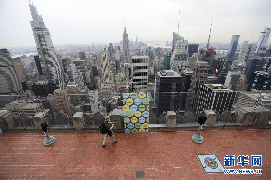 8月6日,在美國紐約,一名攝影師在洛克菲勒中心觀景臺(tái)上參觀。當(dāng)日,3月份暫時(shí)關(guān)閉的洛克菲勒中心觀景臺(tái)恢復(fù)對(duì)公眾開放。每天13時(shí)至21時(shí),人們可戴口罩前往參觀。新華社記者王迎攝