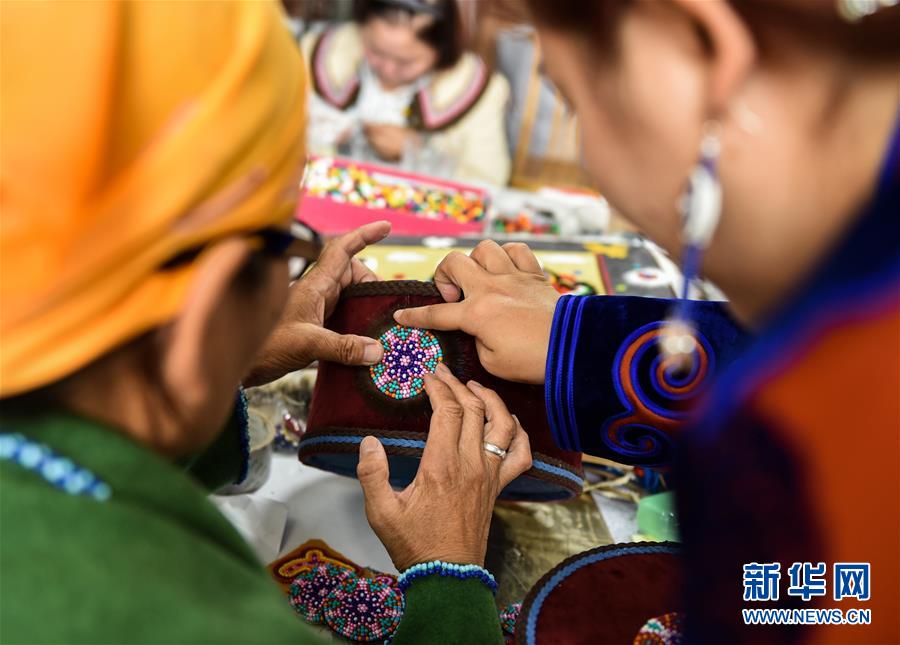 在內(nèi)蒙古自治區(qū)鄂溫克族自治旗巴彥托海鎮(zhèn)太陽花傳承發(fā)展中心,艾吉瑪(右)和手工藝人交流制作工藝(8月6日攝)。新華社記者劉磊攝。