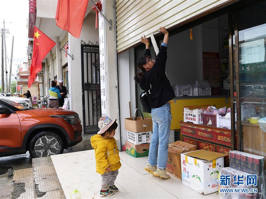 格桑旺姆推開蔬菜店的卷閘門準(zhǔn)備營業(yè)(8月3日攝)。新華社記者 李賀 攝