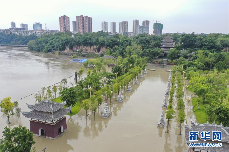 8月12日,重慶市潼南區(qū)大佛寺景區(qū),涪江洪水淹沒景區(qū)廣場(無人機照片)。受強降雨影響,涪江潼南段迎來過境洪水。截至12日下午5時,涪江潼南城區(qū)段最高水位238.5米,超警戒水位0.5米,低于保證水位(240米)。此次過境洪水導致潼南區(qū)部分場鎮(zhèn)低洼地段局部進水,約2700畝農作物不同程度受災。新華社記者 黃偉 攝