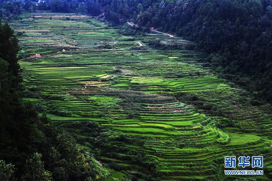 這是8月13日拍攝的鞍子鎮(zhèn)大林村梯田景色。時下,重慶市彭水苗族土家族自治縣鞍子鎮(zhèn)大林村的梯田景色迷人,構(gòu)成一幅幅山鄉(xiāng)田園美景。新華社記者王全超攝