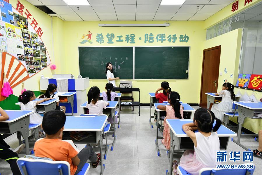 8月13日,在貴州省思南縣雙塘街道麗景社區(qū)易地扶貧搬遷安置點,志愿者在給孩子們上音樂課。今年暑假期間,在貴州省銅仁市思南縣雙塘街道麗景社區(qū)易地扶貧搬遷安置點,來自北京有研集團和思南當?shù)氐闹驹刚邆兝檬钇跁r間,給安置點的孩子們進行音樂、體育、手工、安全教育等課程輔導,幫助搬遷戶照看孩子,讓孩子們在學習中度過一個快樂而有意義的暑假。新華社記者楊文斌攝