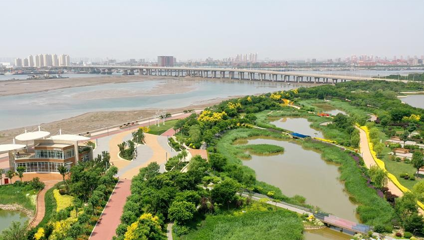 6月8日,小朋友在南堤濱海步道公園騎行。