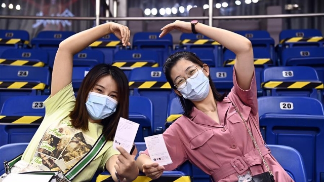 7月26日,在山東青島舉行的2019-2020賽季中國男子籃球職業(yè)聯(lián)賽(CBA)復(fù)賽第二階段(嶗山賽區(qū))比賽中,醫(yī)護(hù)人員、教師、公安戰(zhàn)線人士通過官方購票平臺,完成包括核酸檢測在內(nèi)的相關(guān)流程后進(jìn)場觀看了上海久事隊迎戰(zhàn)山東西王隊的比賽。 觀賽期間,觀賽者須全程佩戴口罩,對號入座,嚴(yán)格保持間隔一米就座。退場時,觀眾須按照自后向前、先兩邊后中間的順序,保持“一米線”社交距離有序退場。