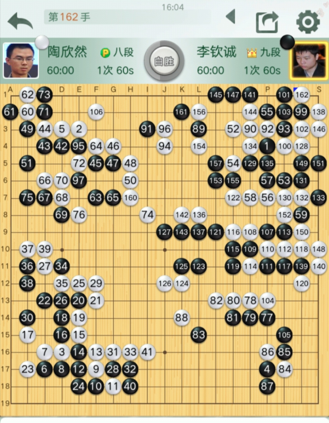 第三臺(tái)李欽誠九段VS陶欣然八段(對(duì)局棋譜)。陶欣然率先鳴金,贏下一局。領(lǐng)隊(duì)梁偉棠九段對(duì)這盤棋很贊賞,認(rèn)為陶欣然這盤棋下得非常漂亮,氣勢(shì)磅礴,有宇宙流再現(xiàn)的感覺。開局在左下角形成白棋取外勢(shì),黑棋取實(shí)地的局面后,陶欣然將外勢(shì)發(fā)揮到淋漓盡致,在上面左右兩個(gè)角都繼續(xù)貫徹意圖,全力推進(jìn),形成了從上邊至中腹的巨大模樣,特別是在右下角一步五路尖沖,技驚四座,后來黑棋勉強(qiáng)進(jìn)來中腹破空,遭到陶欣然的全部殲滅。白棋僅162手,就取得了勝利!技驚四座那步棋是78手,猶如絕藝附身。