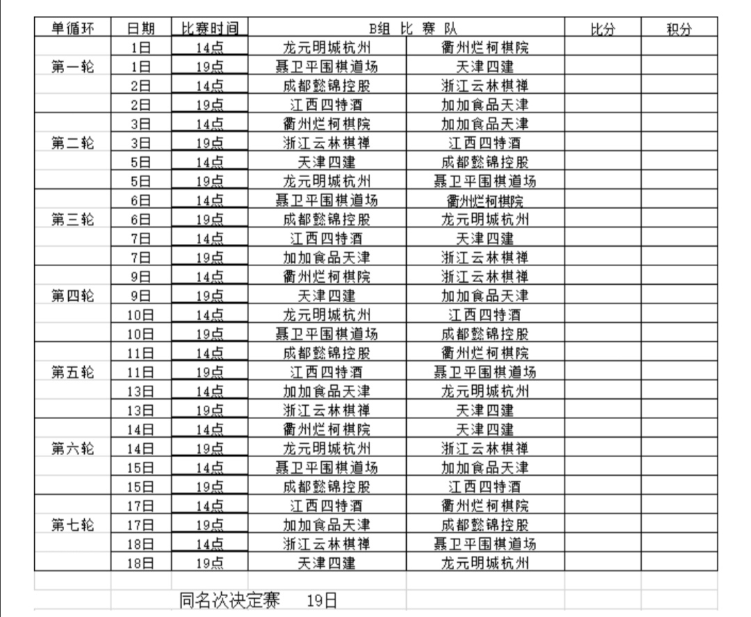 附2:2020年“華為手機(jī)杯”中國圍棋男子甲級(jí)隊(duì)聯(lián)賽網(wǎng)絡(luò)熱身賽AB兩組日程表