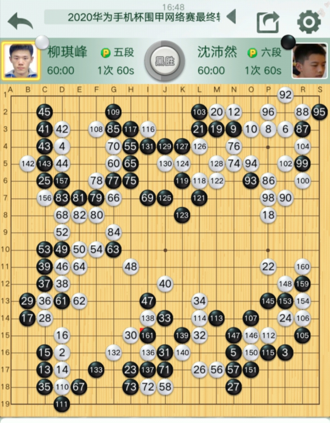 沈沛然自評:布局大致兩分,中盤白棋76斷失誤,應(yīng)當左上角斷補,那樣局面尚早,實戰(zhàn)形成轉(zhuǎn)換黑棋大賺,勝局已定。