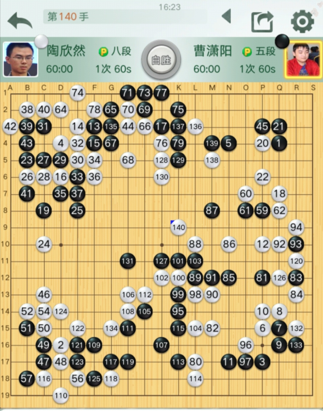 陶欣然自評:布局階段至44的轉(zhuǎn)換差不多。黑63動出至79收獲不大,白方確立優(yōu)勢。白116吃住左下角后領(lǐng)先不少了。