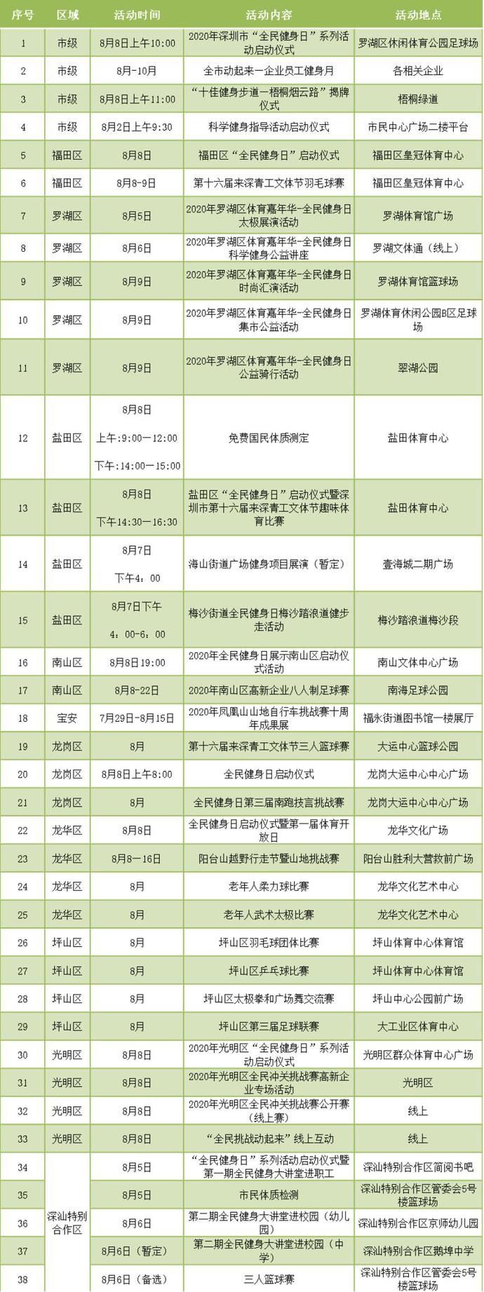 在啟動當(dāng)日,全市各區(qū)也同步聯(lián)動,啟動了“全民健身日”系列活動。即日起至8月10日,深圳將陸續(xù)推出近40項(xiàng)全民健身運(yùn)動系列活動,內(nèi)容涵蓋來深青工文體節(jié)、企業(yè)員工健身月、體育嘉年華系列展演、全民沖關(guān)線上挑戰(zhàn)賽、足球、籃球、老年太極、柔力球、國民體質(zhì)測定、全民健身大講堂、健身步道健步行等。此外,全市各公益體育館也將面向市民免費(fèi)開放,大家可關(guān)注各場館進(jìn)行預(yù)約。