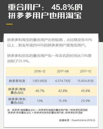 從用戶分布來看,據(jù)企鵝智酷發(fā)布了《拼多多用戶研究報告》,拼多多的一線城市用戶,實際上只比淘寶低了2個百分點;2017年底,有46%的拼多多用戶同時也是淘寶用戶,是所有電商平臺中最高的;拼多多和京東的重合用戶,一年內(nèi)增長了一倍。