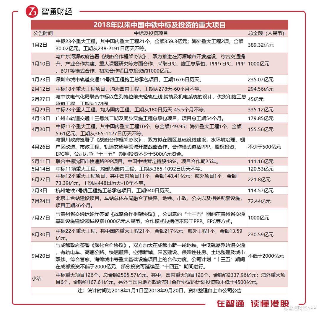 智通財(cái)經(jīng)APP注意到,雖然新簽合同金增速放緩,但中標(biāo)的重大項(xiàng)目卻大幅增加。據(jù)披露,中國中鐵上半年中標(biāo)的重大工程項(xiàng)目(不含與地方政府簽訂的戰(zhàn)略合作協(xié)議)達(dá)到102個(gè),而去年同期僅為49個(gè),涉及項(xiàng)目的金額更是后者的近3倍。