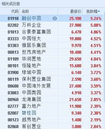 智通財經APP獲悉,多地按揭利率出現松動放款加速,內房股集體上揚,截至15時43分,融創(chuàng)中國(01918)漲5.24%,報價25.1港元,萬科企業(yè)(02202)漲5.08%,中國恒大(03333)漲4.52%,華潤置業(yè)(01109)漲4.04%,中國奧園(03883)漲3.37%,碧桂園(02007)漲2.3%。