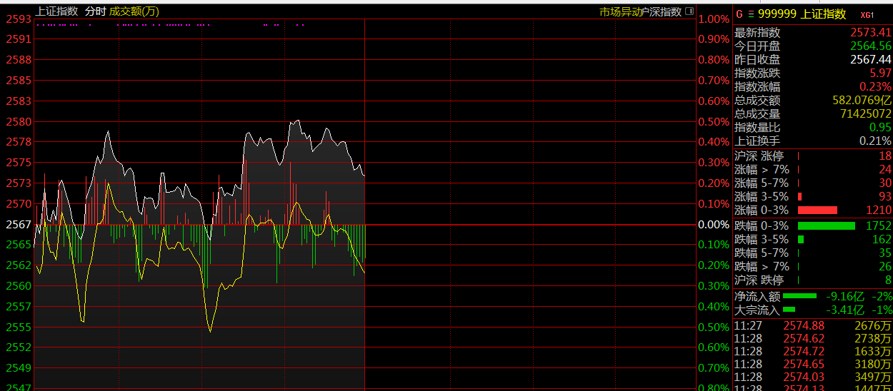 云財(cái)經(jīng)訊,截至早盤收盤,上證指數(shù)報(bào)2573點(diǎn),漲0.23%;深證成指報(bào)7602點(diǎn),漲0.08%;創(chuàng)業(yè)板指數(shù)報(bào)1312點(diǎn),跌0.01%。盤面上,白酒、分散染料、鋰電池等板塊漲幅居前,天津自貿(mào)區(qū)、知識產(chǎn)權(quán)保護(hù)、高送轉(zhuǎn)等板塊跌幅居前。