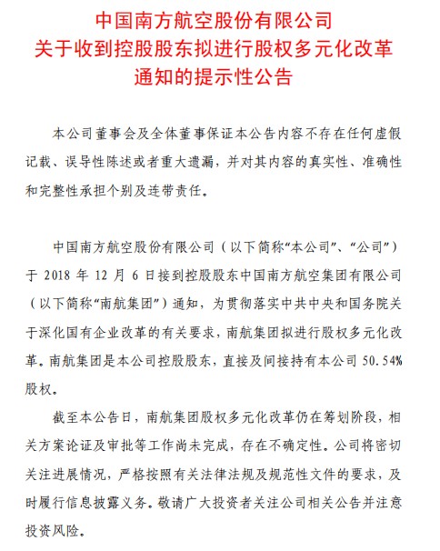 公告中稱,中國南方航空股份有限公司于2018年12月6日接到控股股東中國南方航空集團有限公司通知,為貫徹落實中共中央和國務院關于深化國有企業(yè)改革的有關要求,南航集團擬進行股權多元化改革。南航集團是本公司控股股東,直接及間接持有本公司50.54%股權。截至本公告日,南航集團股權多元化改革仍在籌劃階段,相關方案論證及審批等工作尚未完成,存在不確定性。公司將密切關注進展情況,嚴格按照有關法律法規(guī)及規(guī)范性文件的要求,及時履行信息披露義務。(文文)