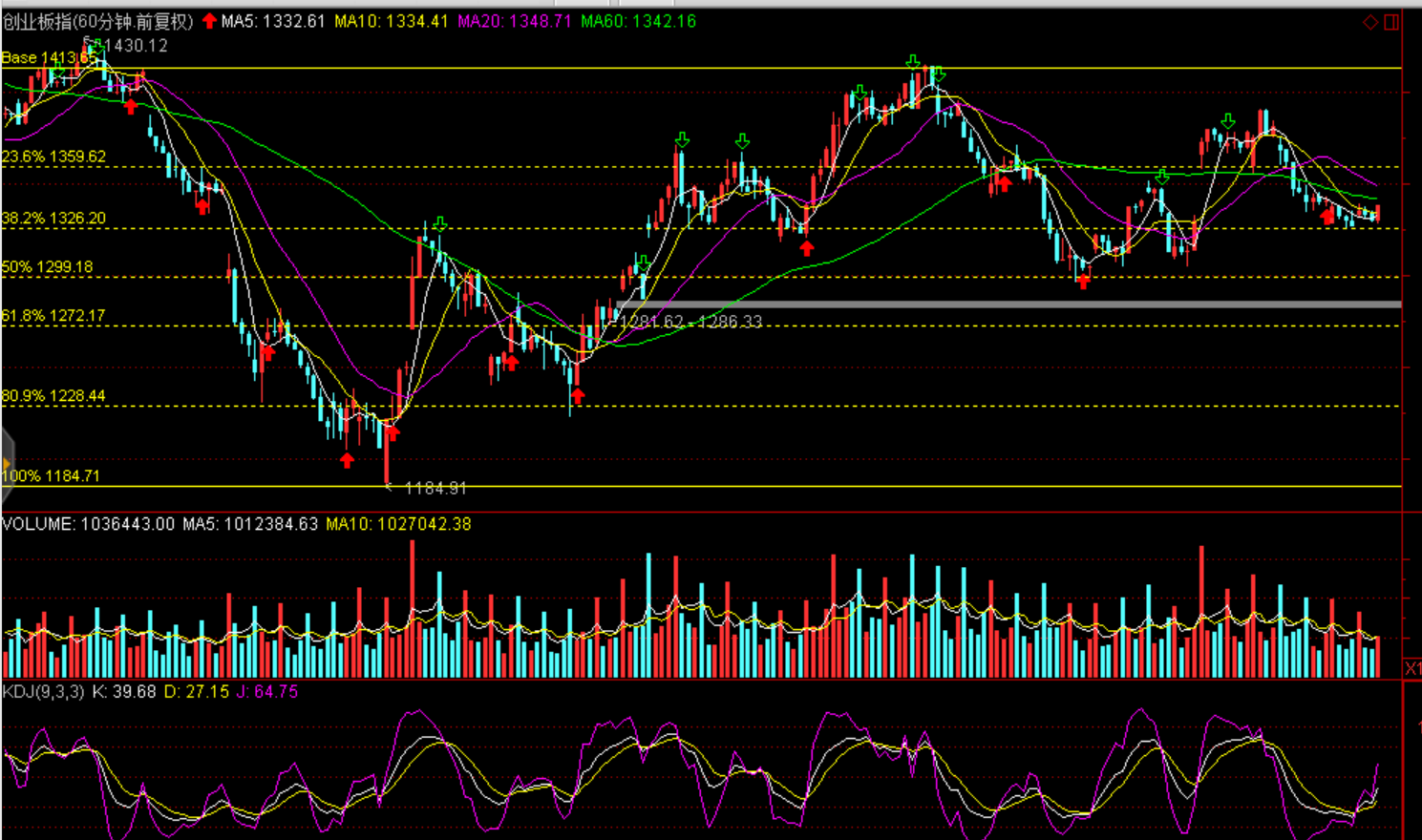 技術面:短期企穩(wěn)回升,弱勢反彈,60分鐘黃金分割線滬綜指2604點、2641點、創(chuàng)業(yè)板1360點一線存在壓力。