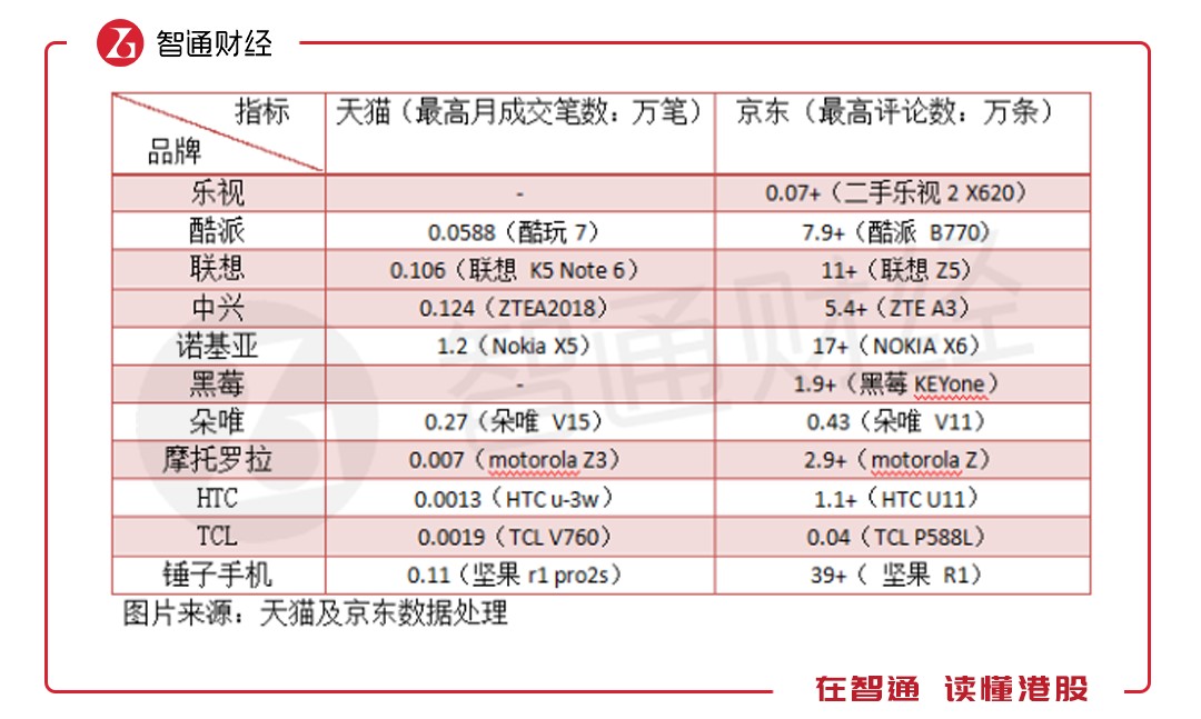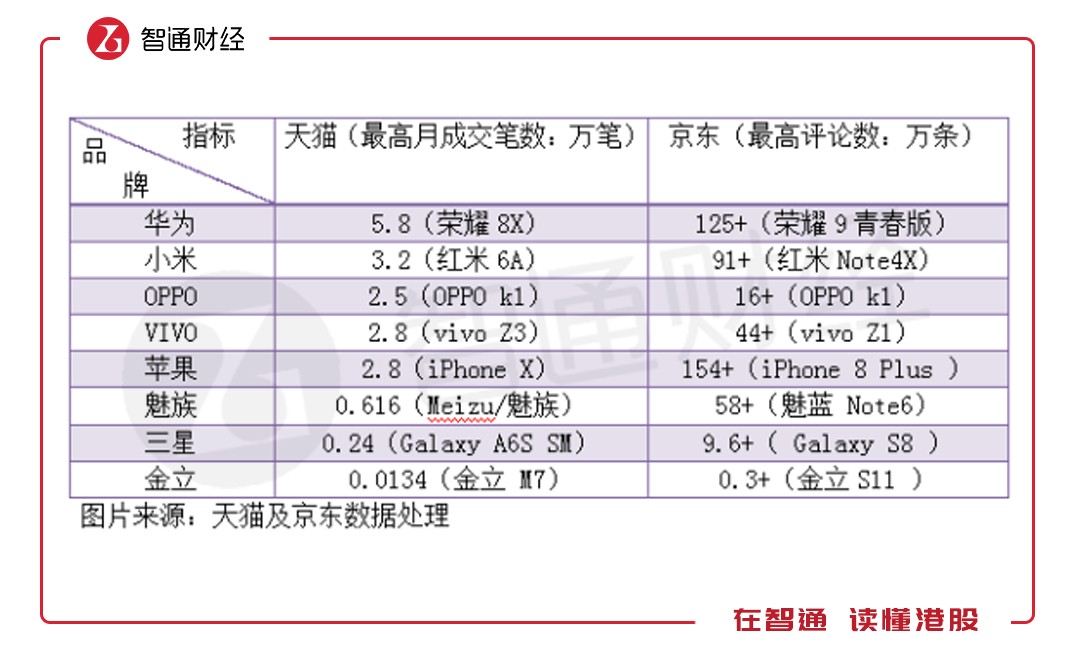 電商的崛起讓手機(jī)多了一條網(wǎng)絡(luò)強(qiáng)大的銷售渠道,目前天貓和京東是電商平臺(tái)中的兩大巨頭,國(guó)內(nèi)的最終商品基本在這兩大平臺(tái)售賣。智通財(cái)經(jīng)APP通過(guò)天貓及京東相對(duì)應(yīng)的月成交筆數(shù)及評(píng)論數(shù)了解不同品牌的智能手機(jī)售賣情況。