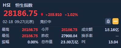 恒生指數(shù)開盤漲285.91點(diǎn)或1.02%,報(bào)28186.75點(diǎn)。國企指數(shù)漲1.1%,報(bào)11057.72點(diǎn)。紅籌指數(shù)漲1.07%,報(bào)4499.71點(diǎn)。大市盤前成交18.16億港元。