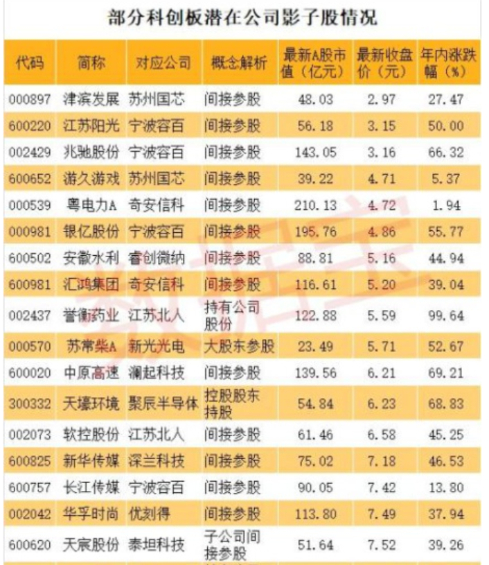科創(chuàng)板影子股:首批創(chuàng)業(yè)板潛在公司背后有超過50只影子股,而這些影子股大多是間接持股。從持股比例來看,最大的是金固股份,持有泰恩達(dá)100%股權(quán)。其他影子股持股比例較大的還有,通化東寶持有33.94%特寶生物、上海醫(yī)藥持有26%復(fù)旦張江、三六零持有22.59%奇安信科、張江高科間接持有10.78%上海微電子、綠地控股持有13%深蘭科技、力源信息持有10.8%云漢芯城、科大國創(chuàng)持有10.15%譽(yù)存科技、南京高科持有8.65%賽特斯、駱駝股份持有6.25%金達(dá)萊等。
