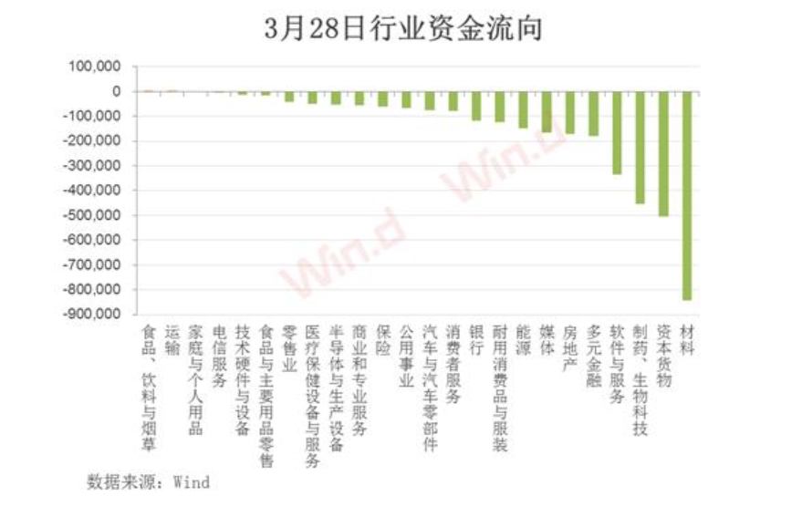 從3月28日行業(yè)主力資金流向來看,絕大多數(shù)行業(yè)出現(xiàn)凈流出,累計凈流出逾350多億元。其中,材料板塊流出最多,超過80億元;資本貨物、制藥與生物科技板塊凈流出均超過40億元。