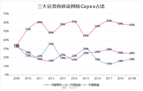 過去十年,中國移動占比三大運營商總資本開支的范圍基本處于50%-60%區(qū)間,電信占比20-30%,聯(lián)通15%-30%。