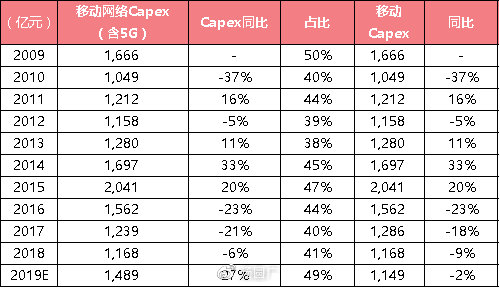 如果把三大運營商資本開支中與寬帶、傳輸網(wǎng)、支撐網(wǎng)等與移動網(wǎng)絡(luò)無關(guān)的資本開支剔除,單獨來看移動網(wǎng)絡(luò)的資本開支可以有更清晰的認識。移動網(wǎng)絡(luò)資本開資相比2018年有27%的同比增長,而移動網(wǎng)絡(luò)也是三大運營商的最重頭,占比總資本開支的49%。