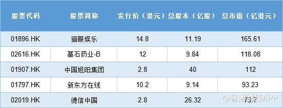 據(jù)智通財經(jīng)APP統(tǒng)計,按上市時的總股本計算,一季度的新股整體體量較小,普遍總市值在50億港元以下,僅三只新股總市值超過百億,分別為貓眼娛樂、基石藥業(yè)-B、中國旭陽集團。其中,貓眼娛樂以165.61億港元的總市值,成為一季度的最重磅股。