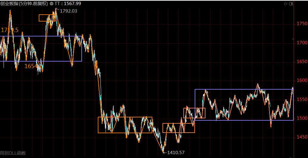 創(chuàng)業(yè)板這里走的比主板強勢很多,周四的陽線直接修復了形態(tài),目前在三十分鐘中樞內(nèi)部運行,中樞上軌1577點,周五已經(jīng)頂?shù)搅酥袠猩宪墸绻轮苣芡黄拼酥袠?,等五分鐘回落線段后構(gòu)建三買,可大膽介入做多。