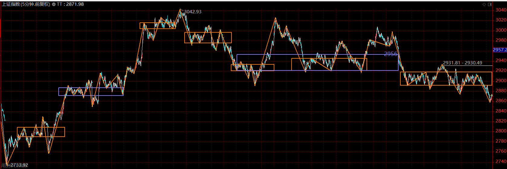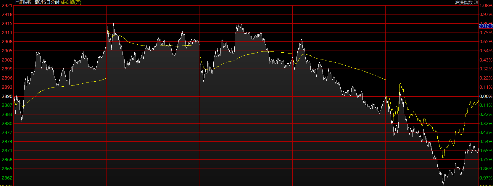 上證指數(shù)上周在等待中樞擴(kuò)展完成后破位下跌,破位力度比較小,而對(duì)結(jié)構(gòu)分解后發(fā)現(xiàn),這次大中樞的盤(pán)整背馳,第一段以五分鐘趨勢(shì)的形式完成,第二段以盤(pán)整的形式完成,且已進(jìn)入了尾聲。因此,料此輪主跌段不會(huì)太久,繼續(xù)維持在前序中樞下軌2850附近企穩(wěn)的判斷。