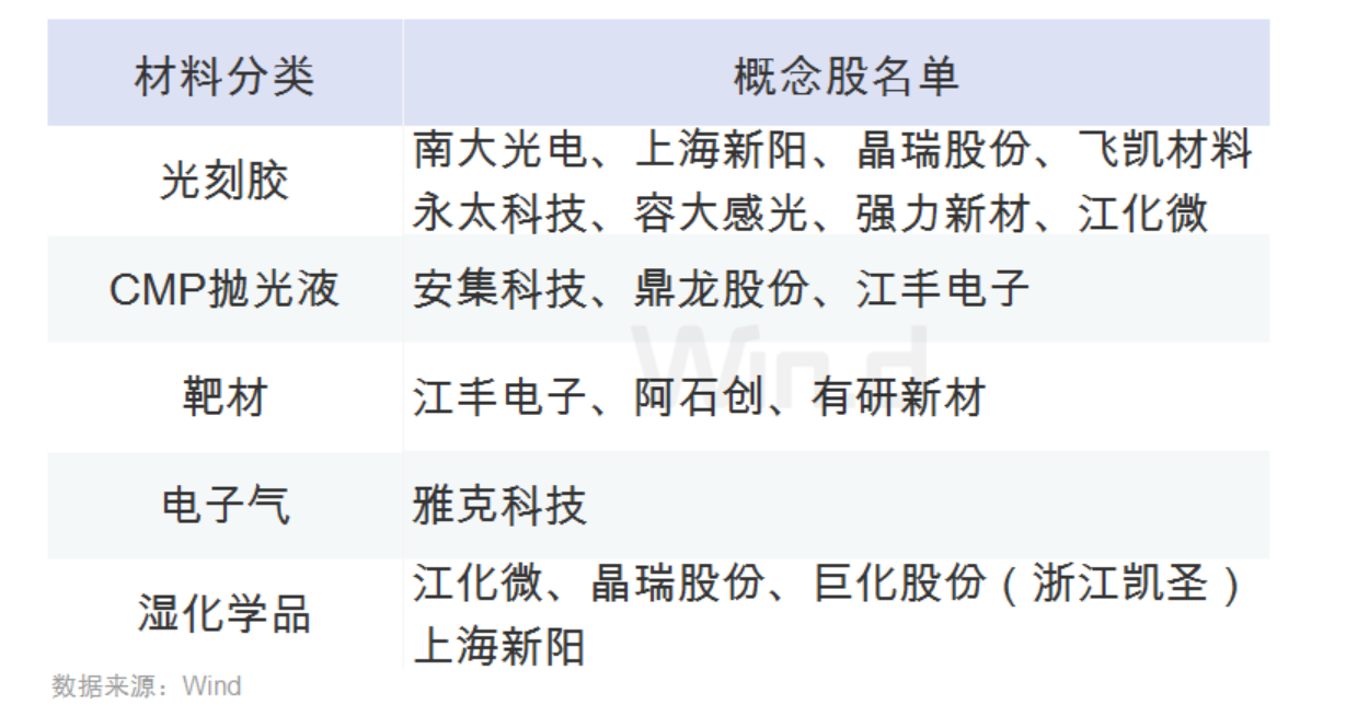 關(guān)注光刻膠:光刻是整個(gè)集成電路制造過程中耗時(shí)最長、難度最大的工藝,耗時(shí)占IC制造50%左右,成本約占IC生產(chǎn)成本的1/3。從需求端來看,光刻膠可分為半導(dǎo)體光刻膠、面板光刻膠和PCB光刻膠。其中,半導(dǎo)體光刻膠的技術(shù)壁壘最高。目前全球光刻膠市場(chǎng)基本被日本和美國企業(yè)所壟斷。國內(nèi)生產(chǎn)的光刻膠中,PCB光刻膠占比94%,LCD光刻膠和半導(dǎo)體光刻膠占比分別僅有3%和2%。國內(nèi)PCB光刻膠國產(chǎn)替代進(jìn)度快,面板光刻膠和半導(dǎo)體光刻膠與國外相比仍有較大差距。