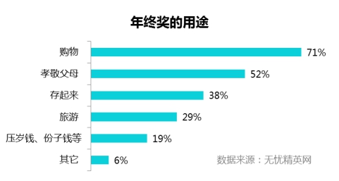 工作生活開支高,職場精英中房奴的比例也很高,很多人指望著用年終獎來購置一些大額的物品,或是用于平日不舍得的支出,犒勞一年辛苦工作的自己。同時,年終獎的發(fā)放時間也多在年底臨近春節(jié),是一年中開支最大的時候,過年回家的交通費、買衣物、孝敬父母,拜年禮、假期出游、給小輩的壓歲錢累積支出非??捎^,年終獎是職場人過年的“救命錢”。