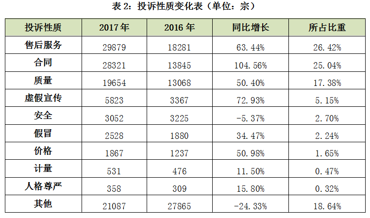 2017年,消費(fèi)者反映最突出的投訴性質(zhì)分別是售后服務(wù)29879宗,占26.42%;合同28321宗,占25.04%;質(zhì)量19654宗,占17.38%;三大性質(zhì)類別的投訴占比都超過了15%。
