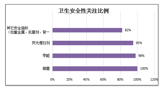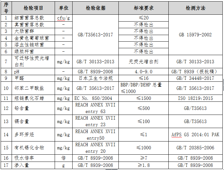 安全性能指標(biāo)包括微生物、甲醛、pH、可遷移性熒光增白劑、化學(xué)物質(zhì)等五個方面。