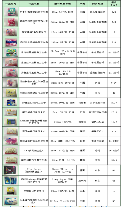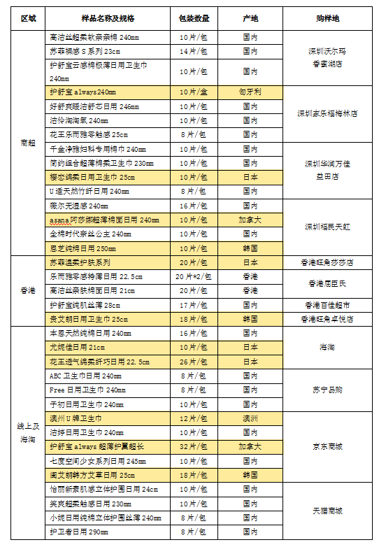 據(jù)前期調(diào)研發(fā)現(xiàn),國外品牌衛(wèi)生巾更受女性消費者青睞,很多消費者認(rèn)為國外品牌衛(wèi)生巾質(zhì)量更優(yōu)更值得信賴,進(jìn)而選擇跨境或海淘等方式購買國外產(chǎn)品。因此,本次樣品分別從深圳商超、香港、線上海淘購買樣品進(jìn)行測試和比較,樣品涉及11款國外原裝產(chǎn)品。詳見下表。
