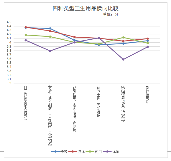本次衛(wèi)生巾比較試驗共招募150名目前沒有從事有關(guān)衛(wèi)生巾行業(yè)的年齡介于16-45歲之間的消費者分別對傳統(tǒng)型衛(wèi)生巾、新型衛(wèi)生巾(液體材料衛(wèi)生巾)、衛(wèi)生棉條、功能性(藥用)衛(wèi)生巾四種類型商品進(jìn)行體驗。要求體驗消費者對所使用的衛(wèi)生用品進(jìn)行1-5分的評價(1分最低,5分最高),主要體驗內(nèi)容及感受如下: