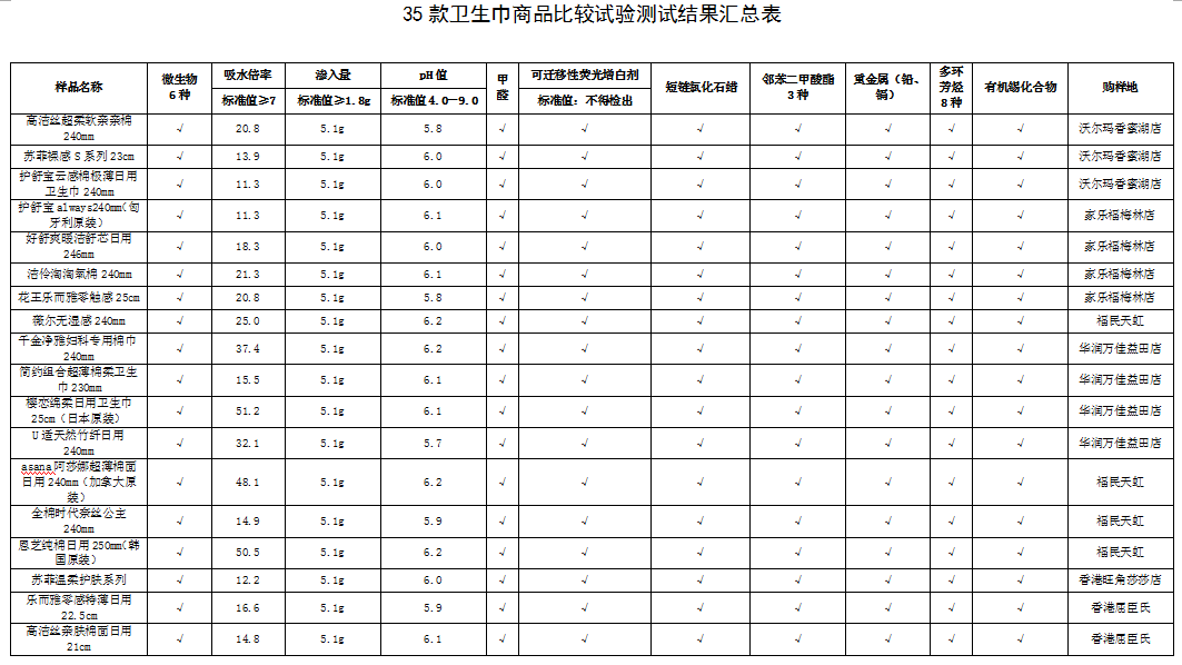 試驗結(jié)果表明參與比較試驗的35款衛(wèi)生巾產(chǎn)品,從安全指標(biāo)方面來看未檢測出超標(biāo)問題;使用性能指標(biāo)方面也均達(dá)到測試標(biāo)準(zhǔn),女性消費者可放心選購。