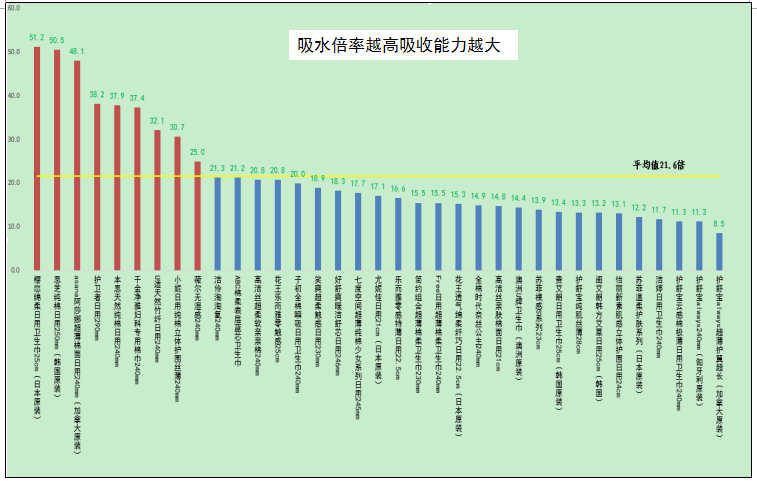 測試結(jié)果顯示,35款衛(wèi)生巾樣品吸水倍率最高達(dá)到51.2倍(櫻戀綿柔日用衛(wèi)生巾,日本原裝),最低為8.5倍(護(hù)舒寶always超薄護(hù)翼超長,加拿大原裝)。對于需要解決經(jīng)期量多量大問題的女性消費者可以優(yōu)先選擇吸水倍率高的衛(wèi)生巾商品。無論選擇哪種吸量衛(wèi)生巾,婦幼保健醫(yī)生建議,衛(wèi)生巾最佳更換時間為2-3小時。測試結(jié)果詳見下圖。