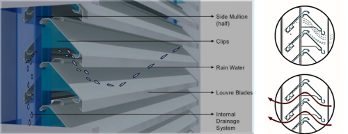 除了屋面幕墻的“防水神經(jīng)系統(tǒng)”,令人驚嘆的還有安裝在展館立面幕墻上的“人字形”百葉,這種雙片百葉同時(shí)具備50%“空氣通風(fēng)性能和95%防雨水性能。巧妙的“人字形”設(shè)計(jì),使得風(fēng)和雨水從百葉片間進(jìn)入時(shí),能夠保證空氣從向上傾斜的第一片百葉有效進(jìn)入,而雨水被第二片向下傾斜的百葉擋住,并由葉片分流至兩邊的豎框里,排出下邊框。“人字形”百葉不僅能完全阻風(fēng)防雨,還具備超高強(qiáng)度,足以抵抗臺(tái)風(fēng)暴雨的侵襲。