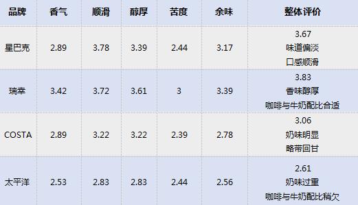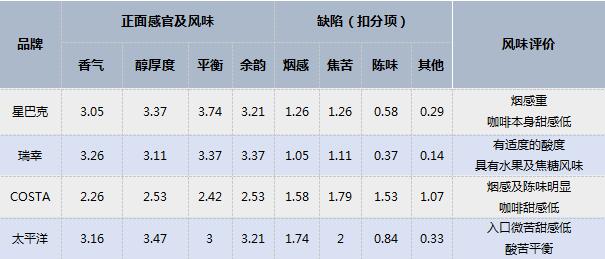 而20位咖啡達(dá)人對4款美式咖啡的整體風(fēng)味評價也不盡相同:瑞幸有適度的酸度,具有水果及焦糖風(fēng)味,接受程度最高;星巴克煙感重,咖啡本身甜感低;COSTA煙感及陳味明顯,酸酐較強(qiáng),咖啡甜感低;太平洋入口微苦甜感低,酸苦較平衡。