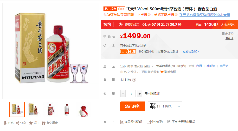 買年貨上蘇寧,買好酒上蘇寧。要說(shuō)年貨節(jié)期間,蘇寧超市酒水類目的明星產(chǎn)品,還要屬1499元的飛天茅臺(tái)酒。年貨節(jié)期間,蘇寧已經(jīng)啟動(dòng)了多輪的飛天茅臺(tái)酒的預(yù)約搶購(gòu),而1月10日即將迎來(lái)新一輪的搶購(gòu)。截至1月8日上午10點(diǎn)多,已經(jīng)有超過(guò)14萬(wàn)實(shí)名認(rèn)證super會(huì)員參與了本次預(yù)約。