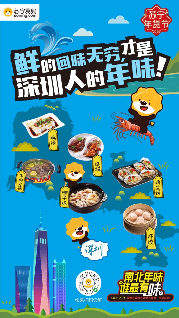 說起年味必提到年夜飯,中國地大物博每個城市的年夜飯各有特色,究竟哪個城市的年味最濃,各家眾說紛紜。為此華南、華中、華北具有代表性的四個城市紛紛站出來為各家城市的年味代言,深圳、武漢、長沙、鄭州四城分別從年味、年俗、年貨、方言等方方面面為消費者獻(xiàn)上了一頓年味大餐。那些記憶里存在的各色過年儀式,味覺里保留的故鄉(xiāng)味道,腦海里熟悉的地方鄉(xiāng)音,在這場年味比拼里一一重現(xiàn),喚醒了大家對于過年的期許,引發(fā)社交平臺上大家對于年味的分享。對于深圳這個移民大城往往被貼上沒有特色年貨的標(biāo)簽,其實不然,作為嶺南文化重要傳承地的深圳擁有眾多特色年俗。并且隨著越來越多的人選擇春節(jié)留在深圳過年,深圳的年味也越來越濃,因此深圳蘇寧在本次南北年味的話題中,不斷深挖深圳年味,打造了一張?zhí)厣某鞘写汗?jié)名片。