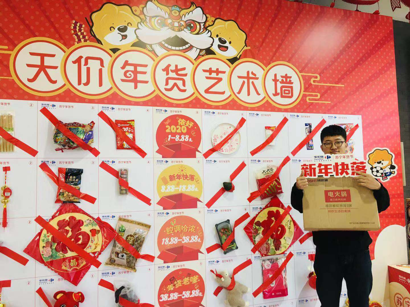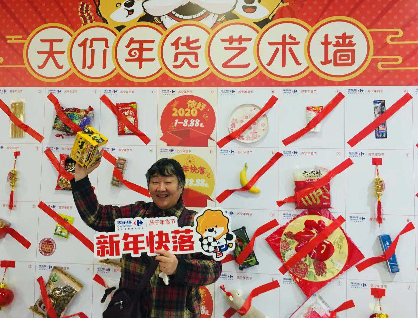 1月10日上午,記者來到家樂福“年味哈濃”天價年貨藝術(shù)墻的活動現(xiàn)場,眾多市民正想躍躍欲試。記者發(fā)現(xiàn),在天價年貨藝術(shù)墻上,有儂好2020、新年快落、腔調(diào)哈濃、年貨老嗲、“鼠”儂最美五類天價年貨。