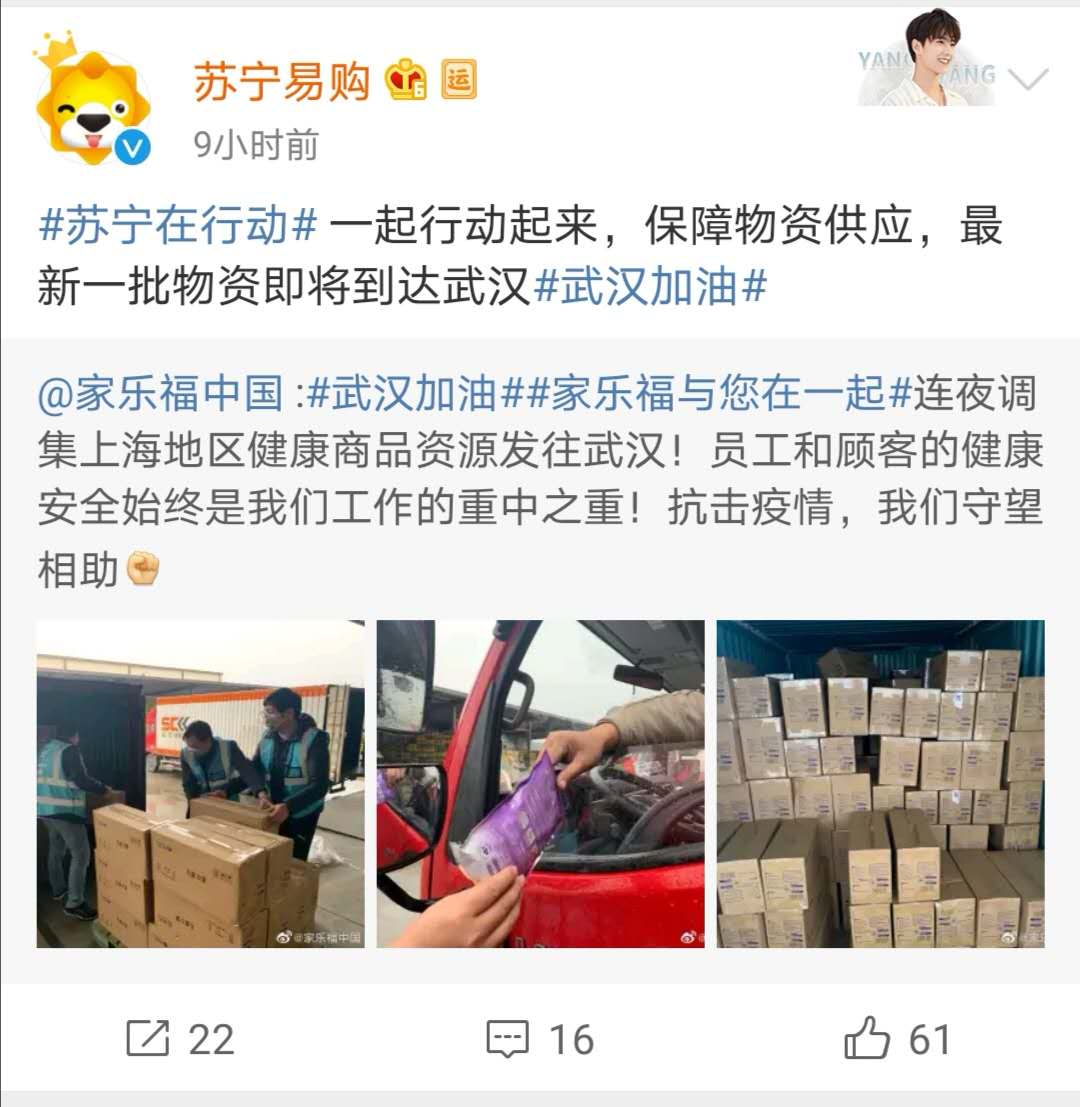 在疫情后方,不少后勤保障單位、組織也是做好了充足的準(zhǔn)備。1月23日,蘇寧旗下家樂福中國(guó)官方微博發(fā)布了一條關(guān)于 #家樂福堅(jiān)決不漲價(jià),虧錢也不能漲!#的微博表示,家樂福中國(guó)管理團(tuán)隊(duì)承諾春節(jié)期間民生用品不漲價(jià),同時(shí)針對(duì)武漢及全國(guó)范圍都提前備好充足貨量,誓與全國(guó)人民一起共渡難關(guān)。