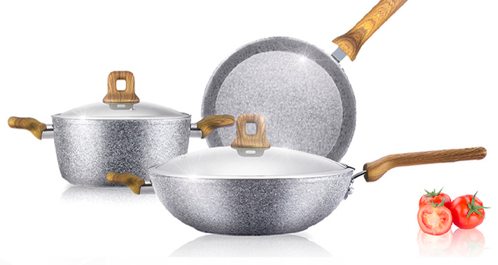 滿足炒、煎、燉多種需求,一套高品質(zhì)、高顏值的鍋具相信你一定不會(huì)拒絕。三禾鍋具三件套 T606是膳石犀利花崗巖健康不粘鍋,采用花崗巖納米起點(diǎn),不粘更持久,耐磨性更高,堪稱品質(zhì)首選。除此之外,其還擁有五層技術(shù)工藝,并采用一體成型設(shè)計(jì),質(zhì)量顏值雙升級。原木紋手柄,防霉防燙;鋼化玻璃蓋,密封防溢;節(jié)能復(fù)合底受熱均勻。三件套內(nèi)包含炒鍋、煎鍋、燉鍋。