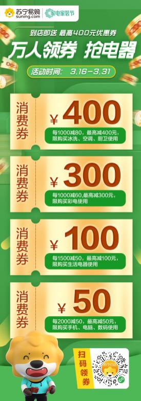 深圳蘇寧針對整個粵東區(qū)域投放近20萬張消費券,該券根據(jù)可用產(chǎn)品類型分為400元、300元、100元、50元四種不同面值。消費券以電子券為形式發(fā)放,消費者可通過深圳蘇寧微信公眾號、深圳蘇寧官方微博、蘇寧云店小程序和蘇寧易購門店進(jìn)行領(lǐng)取,領(lǐng)取成功后,消費券將自動存儲在消費者的蘇寧會員賬戶中,使用時系統(tǒng)會根據(jù)購買的商品類別進(jìn)行自動適配和抵扣結(jié)算。