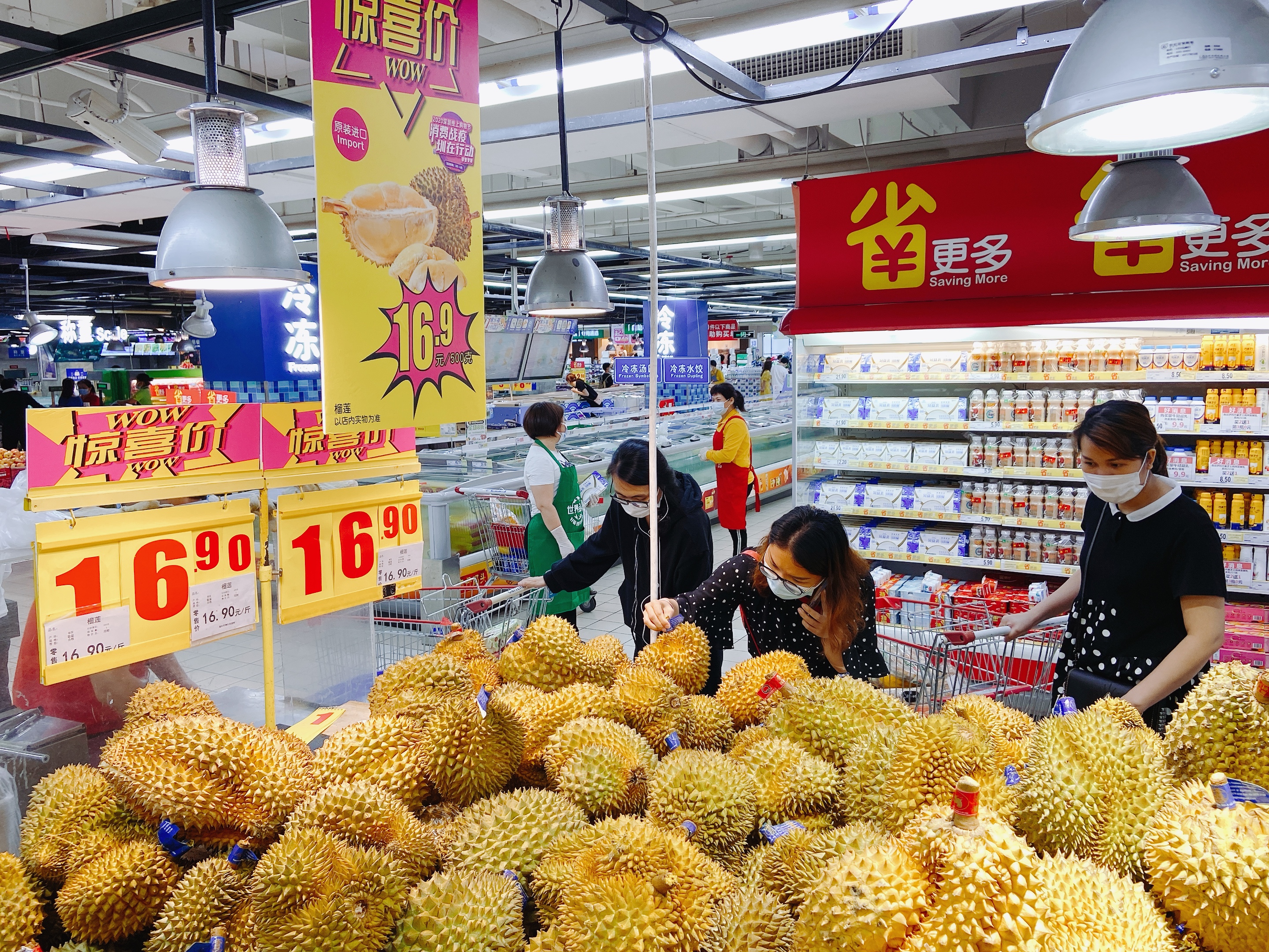 4月19日,記者來到家樂福一門店實(shí)地探訪。剛一步入生鮮區(qū)域,便被“泰國(guó)進(jìn)口榴蓮,白菜價(jià)16.9一斤”的促銷口號(hào)所吸引。整個(gè)生鮮區(qū)不乏各色接地氣的促銷口號(hào),吆喝聲此起彼伏,吸引不少消費(fèi)者駐足選購?!皠偵鲜械奶﹪?guó)金枕頭,你看這個(gè)個(gè)頭、還有這個(gè)味道你聞聞,(每斤)只要16.9,比我們小區(qū)附近的生鮮超市還便宜”,一位受訪者對(duì)高性價(jià)比的泰國(guó)榴蓮贊不絕口。此次探店,記者聽到消費(fèi)者最多的反饋是“品質(zhì)更好了,品種更多了”。家樂福深諳消費(fèi)者的需求,想要促進(jìn)消費(fèi),首先要給消費(fèi)者提供更多更好的選擇?!拔覀冞@次推出的’四月品鮮季’活動(dòng),有來自泰國(guó)、菲律賓等東南亞國(guó)家的反季水果,也有來自巴西、湖北的水產(chǎn)肉類。16.9元一斤的泰國(guó)金枕榴蓮、4.9元一斤的菲律賓切割蕉、25.9元一斤的湖北清水稻田蝦這幾天一直占據(jù)暢銷榜前三的位置”,該店負(fù)責(zé)人介紹。