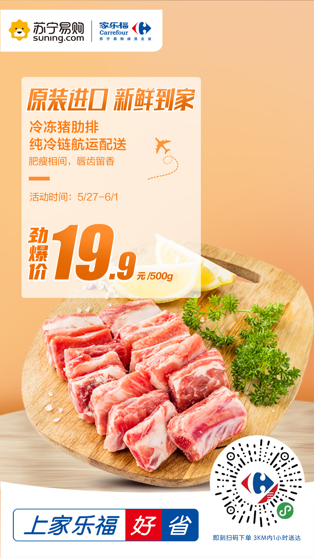 進(jìn)口冷凍豬肋排是本次活動(dòng)的主推爆品之一。生豬按照歐盟標(biāo)準(zhǔn)養(yǎng)殖,采用非轉(zhuǎn)基因飼料喂養(yǎng),全程不使用抗生素,原廠精切,采用純冷鏈航運(yùn)配送,全程可溯源。肥瘦相間,讓人唇齒留香。豬肉價(jià)格高企的背景下,這款進(jìn)口豬肋排原價(jià)39.9元/500g,活動(dòng)期間僅售19.9元/500g,價(jià)格十分惠民,絕對(duì)是秒殺爆品。此外,家樂(lè)福還準(zhǔn)備了澳洲黃牛肉36.8元/斤、帶皮后腿肉19.9元/斤、小龍蝦19.9元/盒、波士頓龍蝦+三文魚(yú)的組合預(yù)售。誠(chéng)意滿滿,只為滿足“食肉獸”的大胃口!