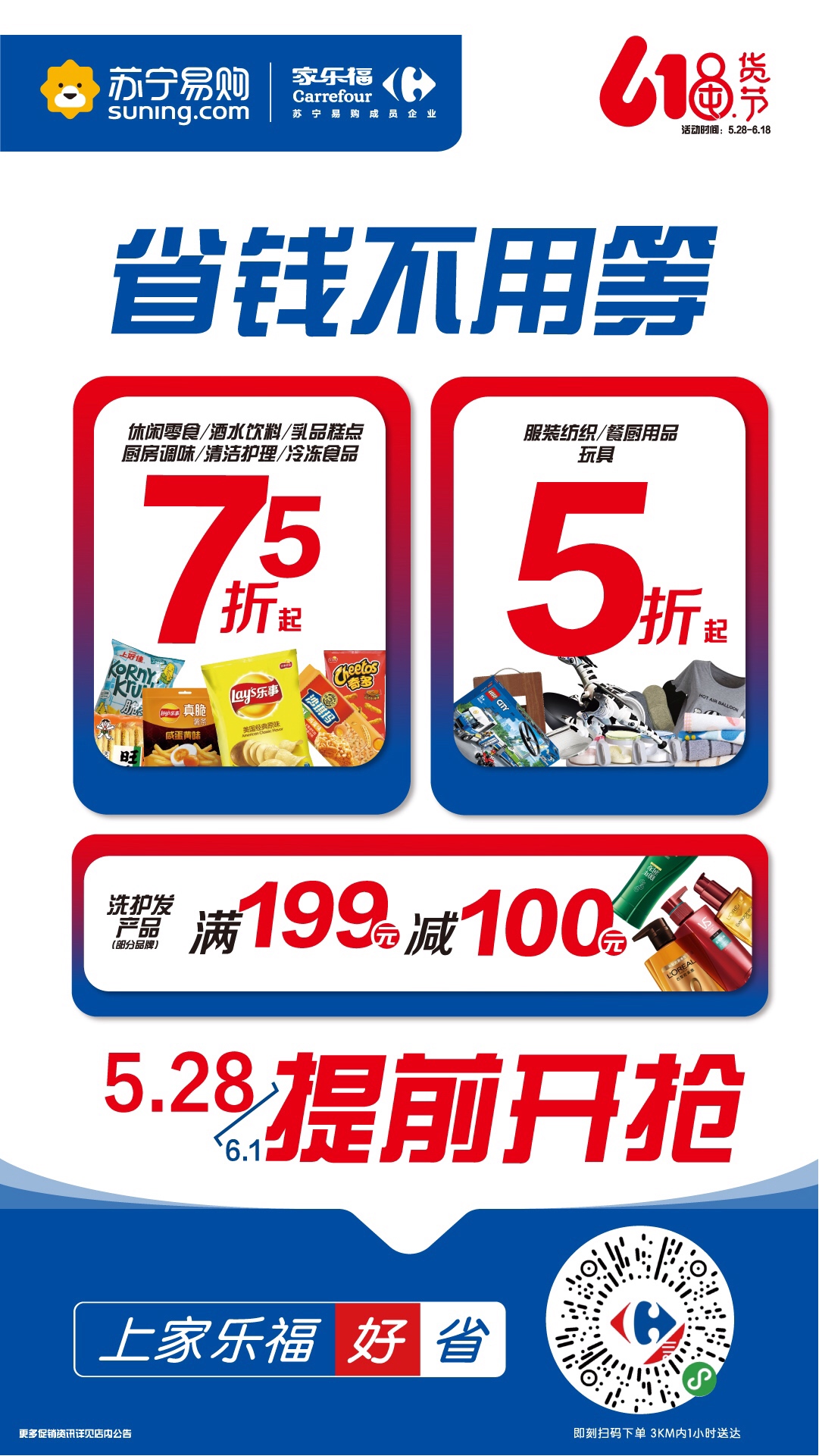 作為蘇寧陣營(yíng)中的排頭兵、蘇寧大快消產(chǎn)業(yè)的核心部分,家樂(lè)福率先出戰(zhàn)。為了給消費(fèi)者提供充足時(shí)間選擇心儀的商品,家樂(lè)福618囤貨節(jié)即將拉開(kāi)帷幕,讓消費(fèi)者盡享“618省錢不用等”的升級(jí)購(gòu)物體驗(yàn)。