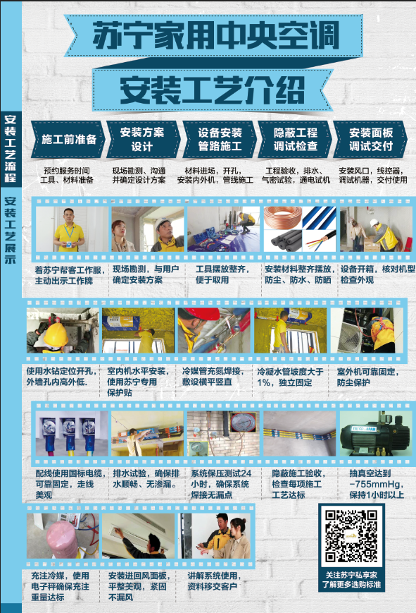 蘇寧中央空調(diào)以《安裝綠寶書》的形式,從“人、材、技”三方面規(guī)定蘇寧施工“365標(biāo)準(zhǔn)”,細(xì)致展示了蘇寧中央空調(diào)的施工流程和具體工藝,包括安裝工程師的職業(yè)行為、施工現(xiàn)場(chǎng)的規(guī)范、安裝工具的要求、安裝材料的標(biāo)準(zhǔn),以及整個(gè)安裝過程的嚴(yán)苛工藝標(biāo)準(zhǔn)和調(diào)試環(huán)節(jié)等諸多方面。五大工序,涉及18個(gè)步驟,為消費(fèi)者全面解讀中央空調(diào)標(biāo)準(zhǔn)化施工的“秘密”。