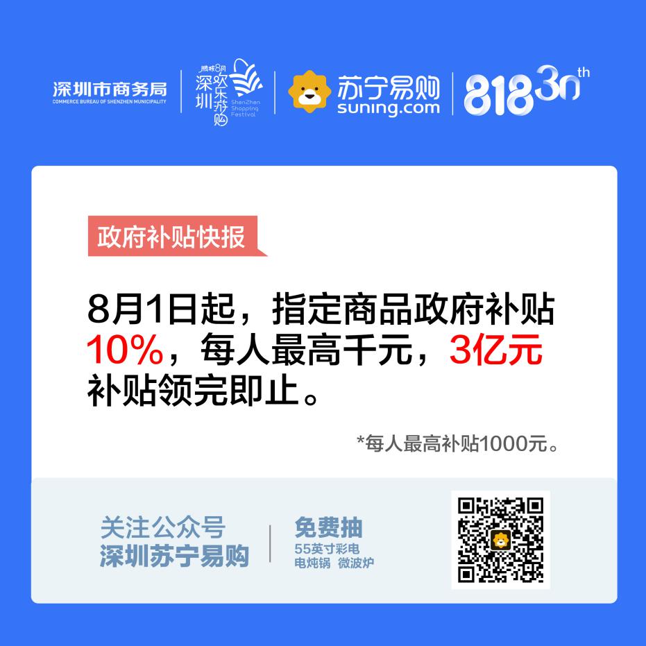 第二屆鵬城八月歡樂游購——深圳家電數(shù)碼消費節(jié)在華強北群星廣場自8月1日起拉開帷幕,已向深圳居民推出3億元家電和數(shù)碼產(chǎn)品補貼政策,用戶按實際購買價格的10%給予補貼,每位居民累計最高補貼1000元?;浉厶K寧電器店及家樂福與大潤發(fā)近3000件商品均可享用。品類覆蓋齊全,商品選擇范圍廣,為消費者帶來一場盛大家電數(shù)碼消費節(jié)的同時為經(jīng)濟消費做出強有力的貢獻。