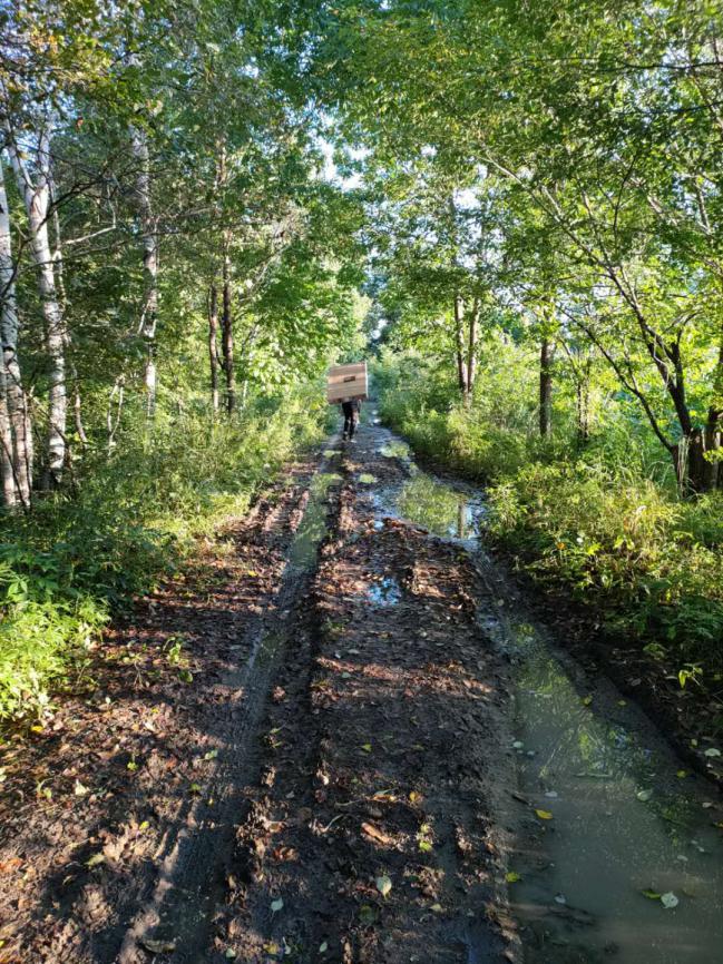 一路開下來,車身濺起不少泥垢??斓侥康牡貢r,一段泥濘的林間小路攔住了王能的去路。原來,道路積水過多,泥土過軟,車輛不能前行。王能隨即將車??吭诼愤?,直接卷上褲腿,扛起電視前行。兩公里的林間路,本就不輕松,扛著電視更是“難上加難”。